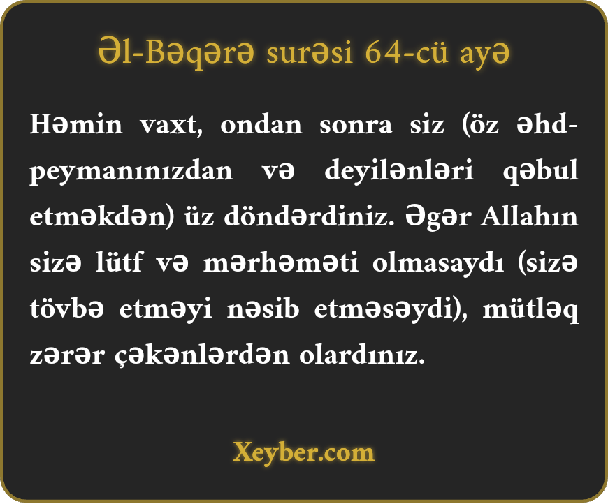 "Bu cərəyandan sonra siz üz döndərdiniz. Əgər sizə Allahın fəzl və rəhməti olmasaydı, hökmən ziyankarlardan idiniz.”