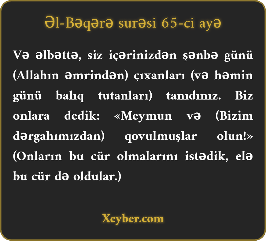 "Şübhəsiz ki, siz özünüzdən olanların şənbə günü itaətsizlik etdiyindən xəbərdarsınız. Biz onlara dedik: "Rədd olunmuş meymunlar şəklinə düşün.”