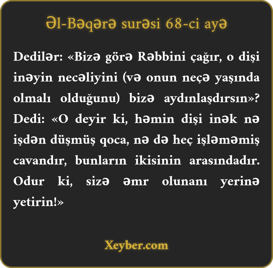 "(Bəni-İsrail Musaya) dedilər: "Bizim üçün Allahdan istə ki, onun necə (inək) olmasını aydınlaşdırsın.” (Musa) dedi: "Allah buyurur ki, o nə çox qoca, nə də çox cavan, bunların arasında olan dişi bir inəkdir. Sizə əmr olunanı yerinə yetirin.”