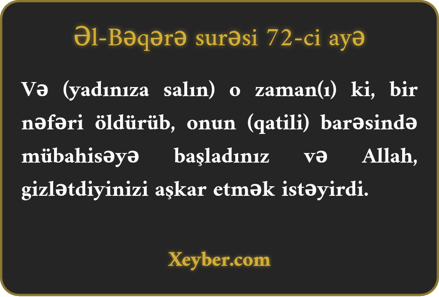 "(Xatırlayın) o zaman ki, birini qətlə yetirdiniz, sonra onun (qatilinin) haqqında mübahisəyə başladınız. Amma Allah sizin gizlətdiklərinizi aşkara çıxarar.”