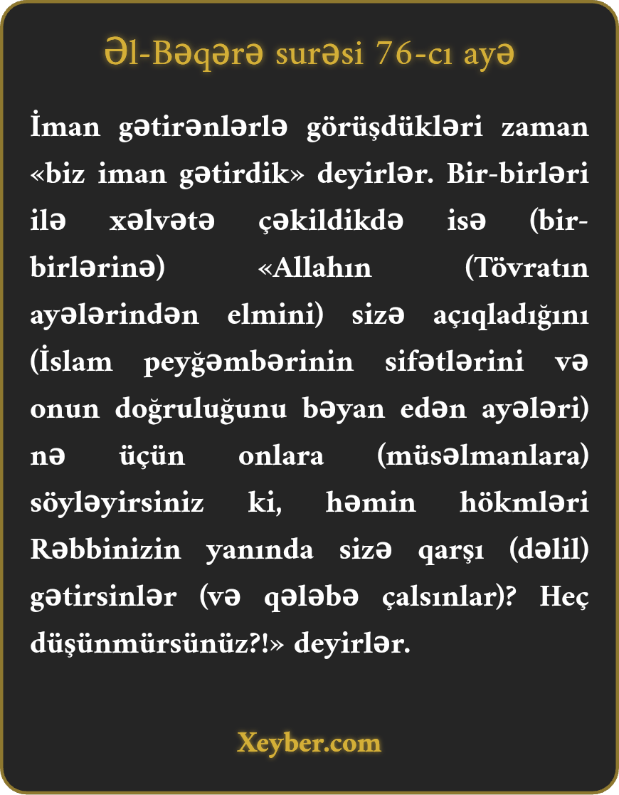 "(Həmin yəhudilər) möminlərlə rastlaşdıqları vaxt deyirlər: "İman gətirdik.” Amma onlardan bəziləri o biriləri ilə xəlvətə çəkildikdə belə deyirlər: "Nə üçün Allahın sizə açdığını (müsəlmanlara) xəbər verirsiniz ki, (qiyamət günü) Rəbbinizin hüzurunda sizin ziddinizə bununla dəlil gətirsinlər? Məgər düşünmürsünüz?”