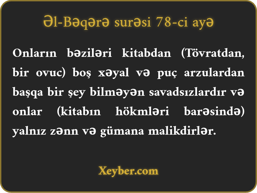 "Onlardan (yəhudilərdən) bəziləri Allah kitabını yalnız öz xəyal və arzularından ibarət bilən, dərs oxumamış fərdlərdir. Onlar yalnız öz gümanlarına bağlıdırlar.”