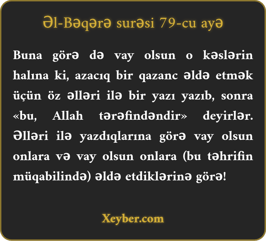 "Vay olsun o kəslər ki, öz əlləri ilə bəzi mətləbləri yazıb sonra deyərlər: "Bu, Allah tərəfindəndir!” Bununla azca pul əldə etmək istəyərlər. Vay onların halına öz əlləri ilə yazdıqlarından dolayı! Vay onların halına bu yolla ələ gətirdiklərindən dolayı!”