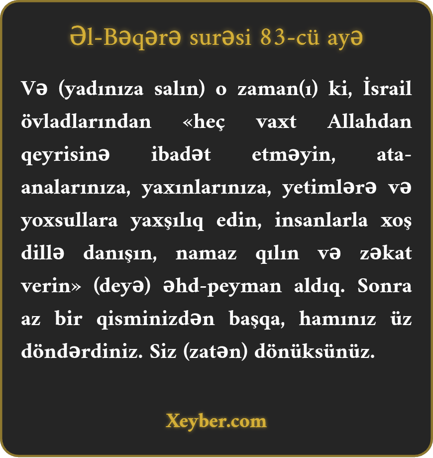 "(Xatırlayın, bir vaxt Bəni-İsraildən əhd aldıq ki, yeganə Allahdan başqasına pərəstiş etməyin, ata-ananıza, qohumlarınıza, yetimlərə və binəvalara ehsan edin, xalqla xoş dillə danışın, namazı bərpa edin və zəkat ödəyin. Amma siz, - bir qisminiz istisna olmaqla - boyun əymədiniz və üz döndərdiniz.”