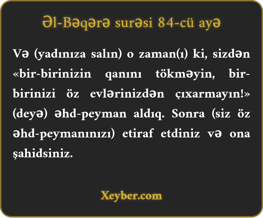 "(Xatırlayın) sizdən bir-birinizin qanını tökməməyiniz və bir-birinizi öz məmləkətinizdən çıxarmamağınız haqqında əhd aldığımız zaman, (bu əhdi) iqrar etdiniz və özünüz buna şahidsiniz.”