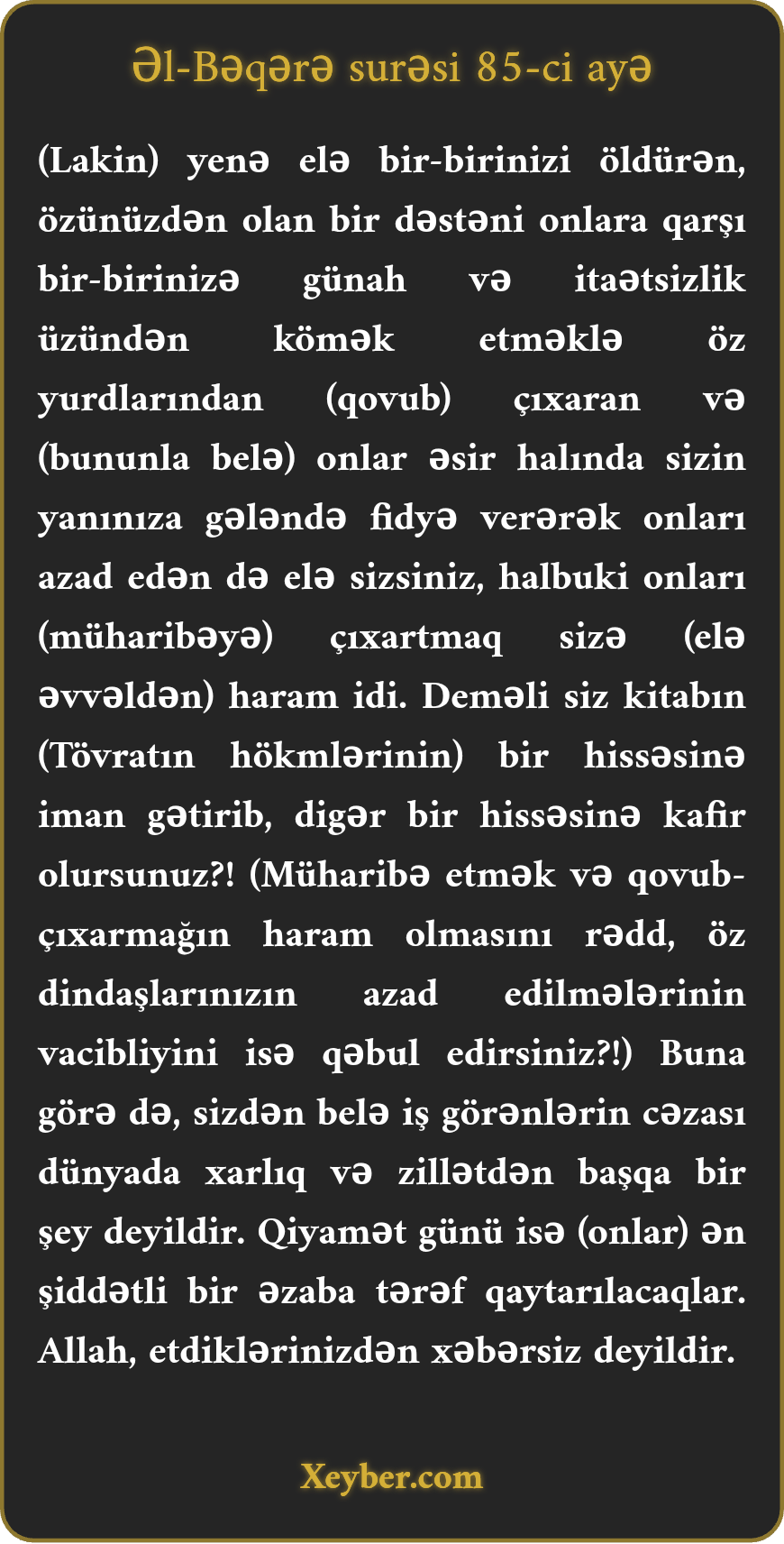 "Bir-birinizi qətlə yetirən, özünüzdən bir qrupu diyarlarından xaric edən, onlara qarşı günah və təcavüzdə bir-birinizə arxa duran sizsiniz. Amma əgər həmin adamlar əsir halda yanınıza gəlsələr (azad etmək üçün) onların fidyəsini ödəyirsiniz. Hansı ki, (təkcə öldürmək yox, həm də) onları ixrac etmək sizə haram idi. Yoxsa səmavi kitabın bəzi göstərişlərinə iman gətirir, bəzilərinə isə kafir olursunuz? Sizlərdən bu işi görən hər bir adamın cəzası bu dünyada rüsvayçılıqdan başqa bir şey olmayacaq. Qiyamət günü isə o yenidən ən çətin əzaba düçar olacaq. Allah gördüyünüz işdən qafil deyil.”