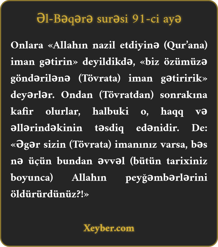 "Onlara "Allahın nazil etdiyinə iman gətirin." deyə əmr olunduqda deyərlər: "Biz yalnız o şeyə iman gətirərik ki, özümüzə nazil olsun..." Bundan qeyrisinə kafir olarlar. Hansı ki, o (Quran) haqdır və onların Tövratdan bildiklərini təsdiq edir. De ki, əgər mömin idinizsə, nə üçün bundan qabaq ilahi peyğəmbərləri qətlə yetirdiniz?!”