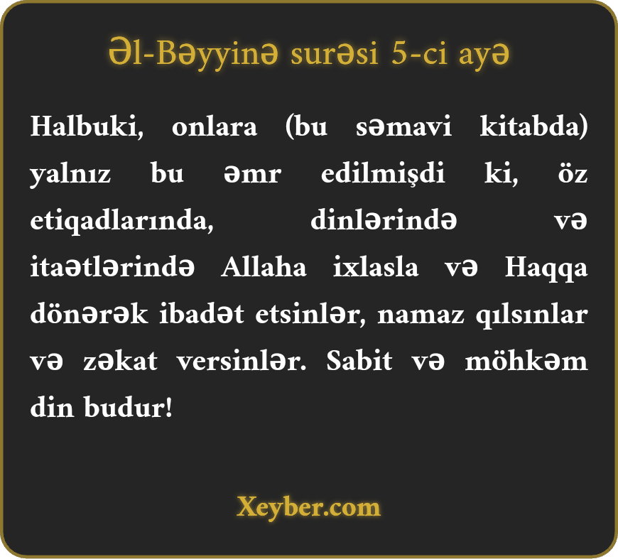 Halbuki, onlara (bu səmavi kitabda) yalnız bu əmr edilmişdi ki, öz etiqadlarında, dinlərində və itaətlərində Allaha ixlasla və Haqqa dönərək ibadət etsinlər, namaz qılsınlar və zəkat versinlər. Sabit və möhkəm din budur!