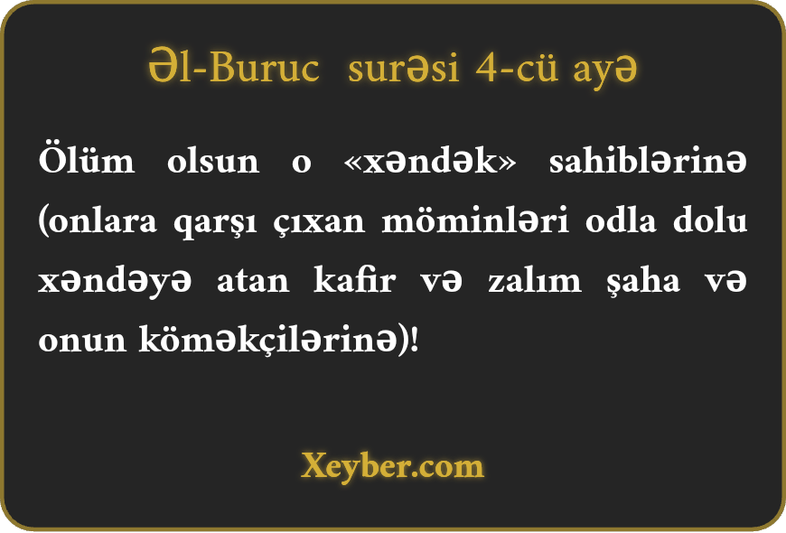 Ölüm olsun o «xəndək» sahiblərinə (onlara qarşı çıxan möminləri odla dolu xəndəyə atan kafir və zalım şaha və onun köməkçilərinə)!