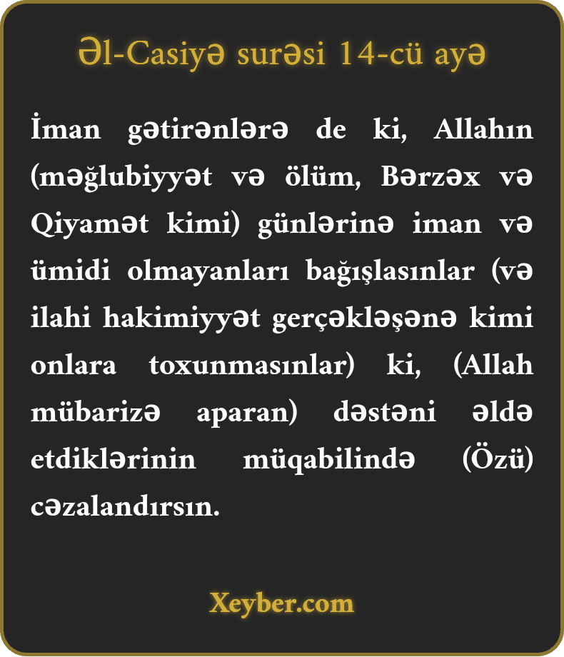 İman gətirənlərə de ki, Allahın (məğlubiyyət və ölüm, Bərzəx və Qiyamət kimi) günlərinə iman və ümidi olmayanları bağışlasınlar (və ilahi hakimiyyət gerçəkləşənə kimi onlara toxunmasınlar) ki, (Allah mübarizə aparan) dəstəni əldə etdiklərinin müqabilində (Özü) cəzalandırsın.