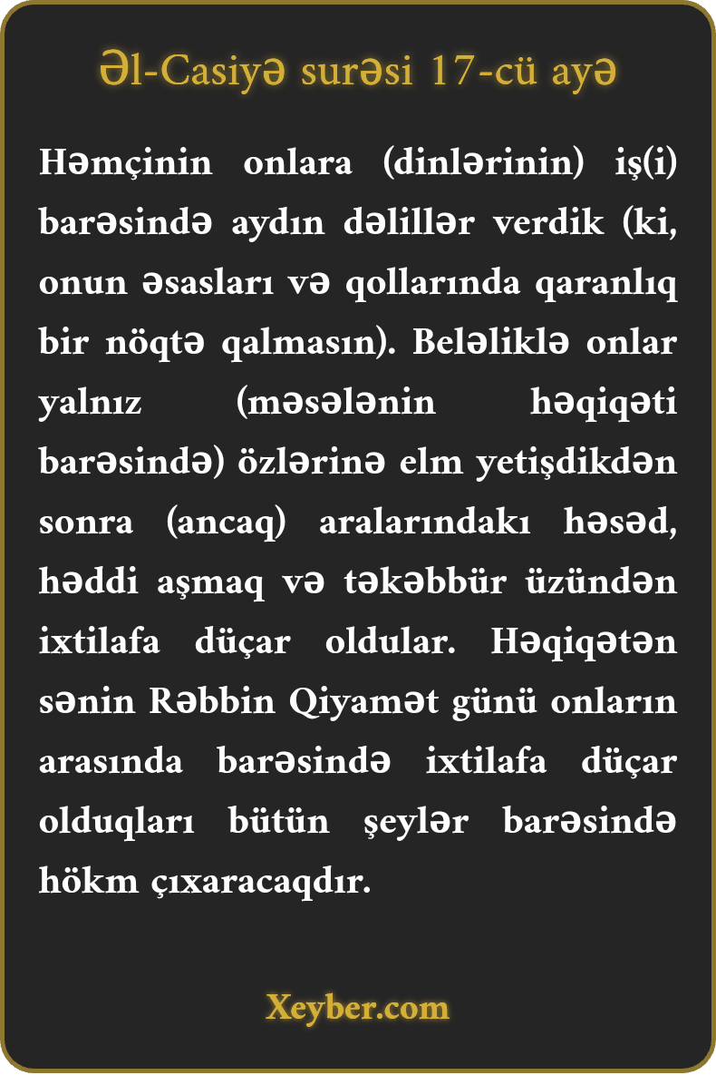Həmçinin onlara (dinlərinin) iş(i) barəsində aydın dəlillər verdik (ki, onun əsasları və qollarında qaranlıq bir nöqtə qalmasın). Beləliklə onlar yalnız (məsələnin həqiqəti barəsində) özlərinə elm yetişdikdən sonra (ancaq) aralarındakı həsəd, həddi aşmaq və təkəbbür üzündən ixtilafa düçar oldular. Həqiqətən sənin Rəbbin Qiyamət günü onların arasında barəsində ixtilafa düçar olduqları bütün şeylər barəsində hökm çıxaracaqdır.