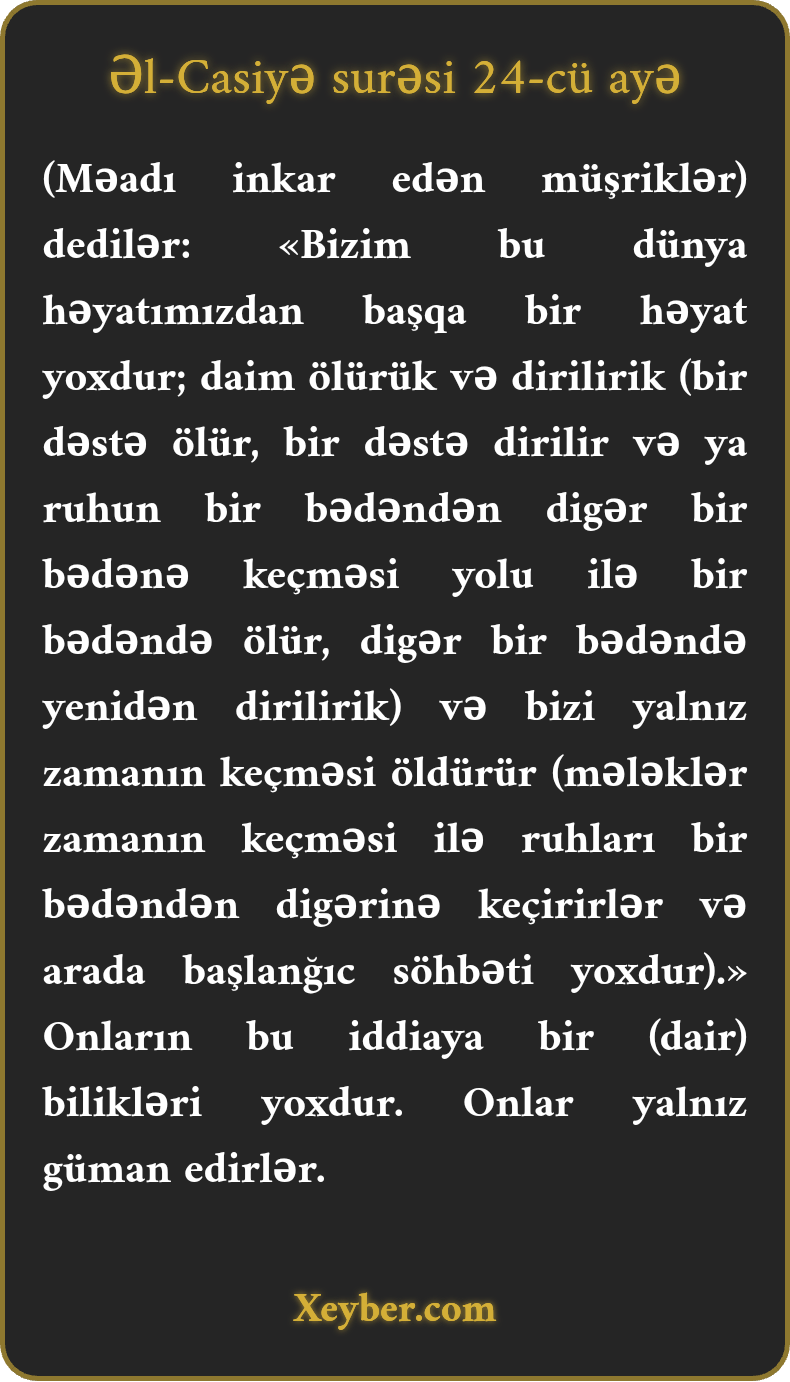 (Məadı inkar edən müşriklər) dedilər: «Bizim bu dünya həyatımızdan başqa bir həyat yoxdur; daim ölürük və dirilirik (bir dəstə ölür, bir dəstə dirilir və ya ruhun bir bədəndən digər bir bədənə keçməsi yolu ilə bir bədəndə ölür, digər bir bədəndə yenidən dirilirik) və bizi yalnız zamanın keçməsi öldürür (mələklər zamanın keçməsi ilə ruhları bir bədəndən digərinə keçirirlər və arada başlanğıc söhbəti yoxdur).» Onların bu iddiaya bir (dair) bilikləri yoxdur. Onlar yalnız güman edirlər.