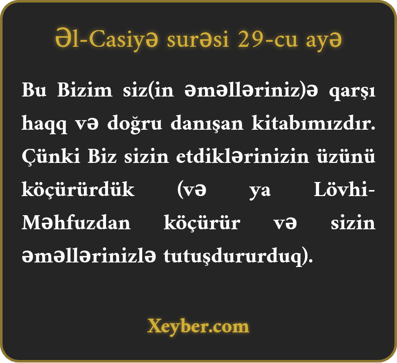 Bu Bizim siz(in əməlləriniz)ə qarşı haqq və doğru danışan kitabımızdır. Çünki Biz sizin etdiklərinizin üzünü köçürürdük (və ya Lövhi-Məhfuzdan köçürür və sizin əməllərinizlə tutuşdururduq).