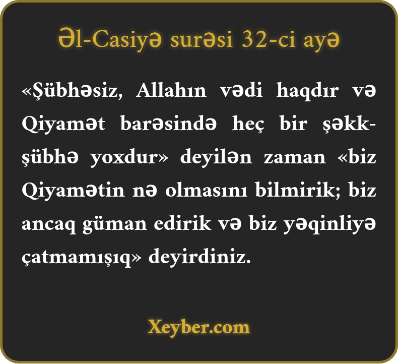 «Şübhəsiz, Allahın vədi haqdır və Qiyamət barəsində heç bir şəkk-şübhə yoxdur» deyilən zaman «biz Qiyamətin nə olmasını bilmirik; biz ancaq güman edirik və biz yəqinliyə çatmamışıq» deyirdiniz.