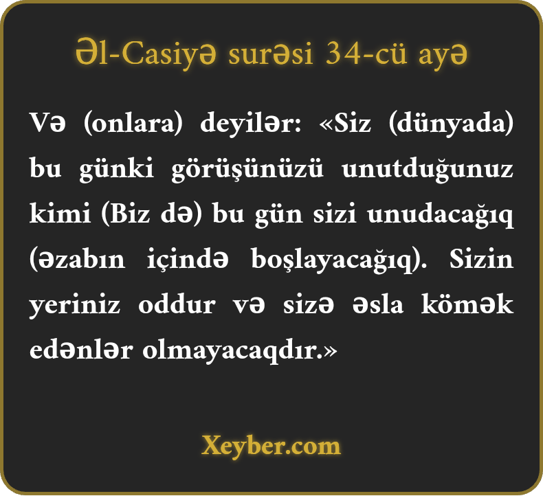 Və (onlara) deyilər: «Siz (dünyada) bu günki görüşünüzü unutduğunuz kimi (Biz də) bu gün sizi unudacağıq (əzabın içində boşlayacağıq). Sizin yeriniz oddur və sizə əsla kömək edənlər olmayacaqdır.»