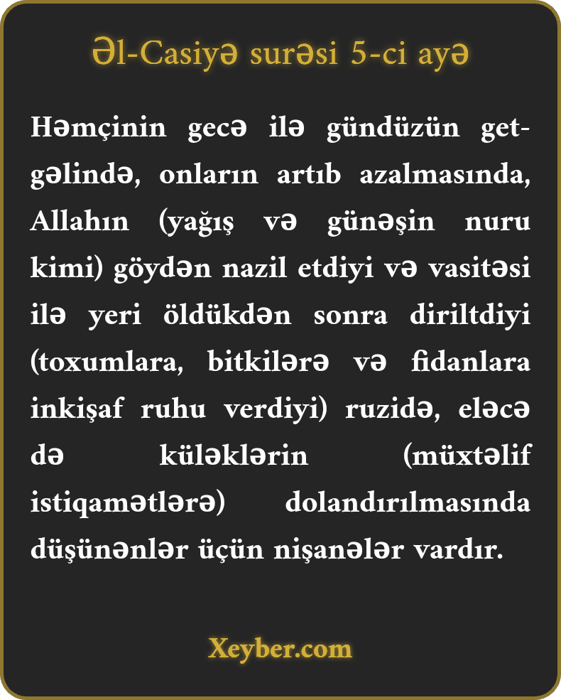 Həmçinin gecə ilə gündüzün get-gəlində, onların artıb azalmasında, Allahın (yağış və günəşin nuru kimi) göydən nazil etdiyi və vasitəsi ilə yeri öldükdən sonra diriltdiyi (toxumlara, bitkilərə və fidanlara inkişaf ruhu verdiyi) ruzidə, eləcə də küləklərin (müxtəlif istiqamətlərə) dolandırılmasında düşünənlər üçün nişanələr vardır.