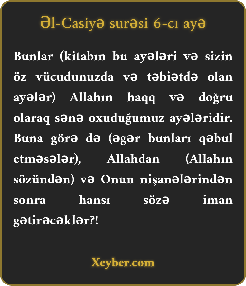 Bunlar (kitabın bu ayələri və sizin öz vücudunuzda və təbiətdə olan ayələr) Allahın haqq və doğru olaraq sənə oxuduğumuz ayələridir. Buna görə də (əgər bunları qəbul etməsələr), Allahdan (Allahın sözündən) və Onun nişanələrindən sonra hansı sözə iman gətirəcəklər?!