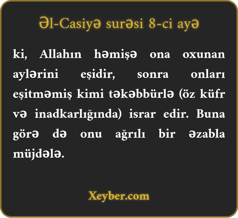 ki, Allahın həmişə ona oxunan aylərini eşidir, sonra onları eşitməmiş kimi təkəbbürlə (öz küfr və inadkarlığında) israr edir. Buna görə də onu ağrılı bir əzabla müjdələ.