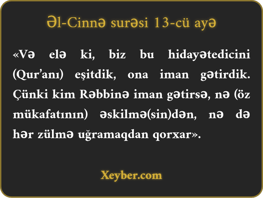 «Və elə ki, biz bu hidayətedicini (Qur’anı) eşitdik, ona iman gətirdik. Çünki kim Rəbbinə iman gətirsə, nə (öz mükafatının) əskilmə(sin)dən, nə də hər zülmə uğramaqdan qorxar».