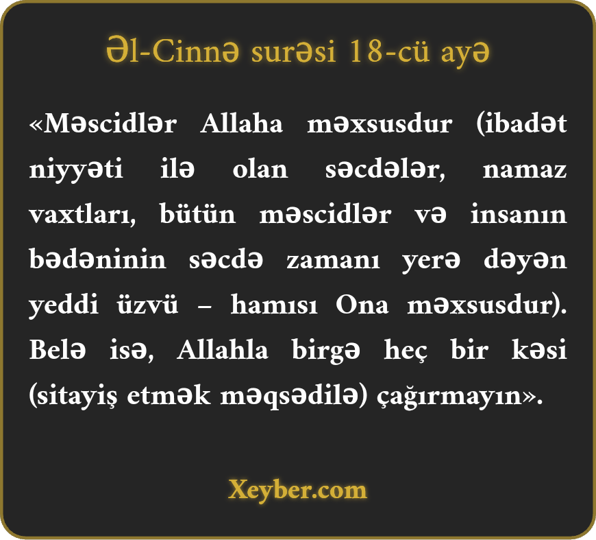 «Məscidlər Allaha məxsusdur (ibadət niyyəti ilə olan səcdələr, namaz vaxtları, bütün məscidlər və insanın bədəninin səcdə zamanı yerə dəyən yeddi üzvü – hamısı Ona məxsusdur). Belə isə, Allahla birgə heç bir kəsi (sitayiş etmək məqsədilə) çağırmayın».