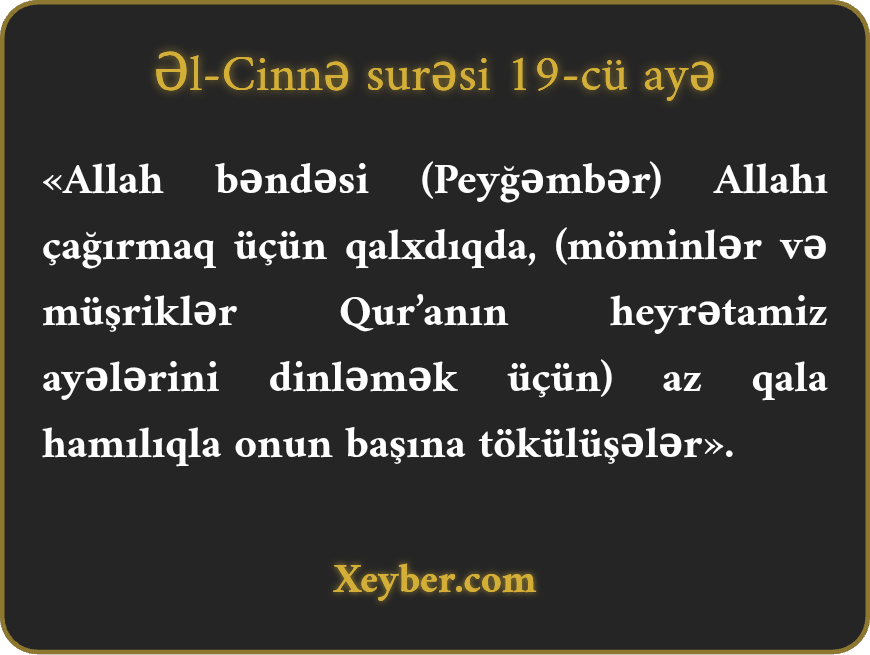 «Allah bəndəsi (Peyğəmbər) Allahı çağırmaq üçün qalxdıqda, (möminlər və müşriklər Qur’anın heyrətamiz ayələrini dinləmək üçün) az qala hamılıqla onun başına tökülüşələr».