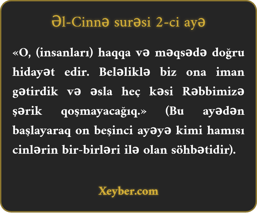 «O, (insanları) haqqa və məqsədə doğru hidayət edir. Beləliklə biz ona iman gətirdik və əsla heç kəsi Rəbbimizə şərik qoşmayacağıq.» (Bu ayədən başlayaraq on beşinci ayəyə kimi hamısı cinlərin bir-birləri ilə olan söhbətidir).