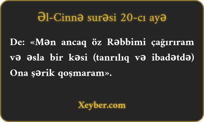 De: «Mən ancaq öz Rəbbimi çağırıram və əsla bir kəsi (tanrılıq və ibadətdə) Ona şərik qoşmaram».