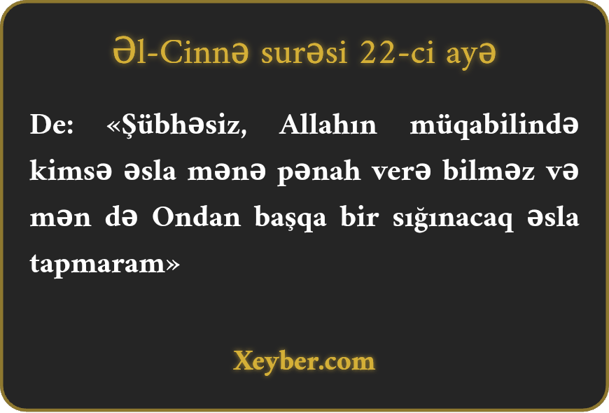 De: «Şübhəsiz, Allahın müqabilində kimsə əsla mənə pənah verə bilməz və mən də Ondan başqa bir sığınacaq əsla tapmaram»