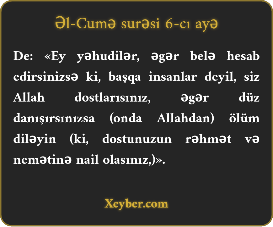 De: «Ey yəhudilər, əgər belə hesab edirsinizsə ki, başqa insanlar deyil, siz Allah dostlarısınız, əgər düz danışırsınızsa (onda Allahdan) ölüm diləyin (ki, dostunuzun rəhmət və nemətinə nail olasınız,)».
