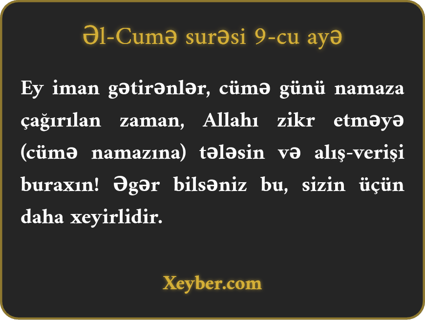 Ey iman gətirənlər, cümə günü namaza çağırılan zaman, Allahı zikr etməyə (cümə namazına) tələsin və alış-verişi buraxın! Əgər bilsəniz bu, sizin üçün daha xeyirlidir.