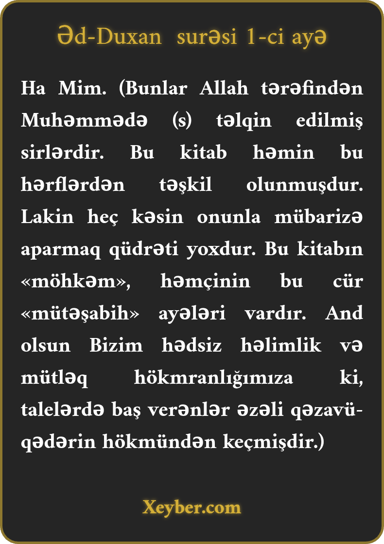 Ha Mim. (s">(Bunlar Allah tərəfindən Muhəmmədə (s) təlqin edilmiş sirlərdir. Bu kitab həmin bu hərflərdən təşkil olunmuşdur. Lakin heç kəsin onunla mübarizə aparmaq qüdrəti yoxdur. Bu kitabın «möhkəm», həmçinin bu cür «mütəşabih» ayələri vardır. And olsun Bizim hədsiz həlimlik və mütləq hökmranlığımıza ki, talelərdə baş verənlər əzəli qəzavü-qədərin hökmündən keçmişdir.)