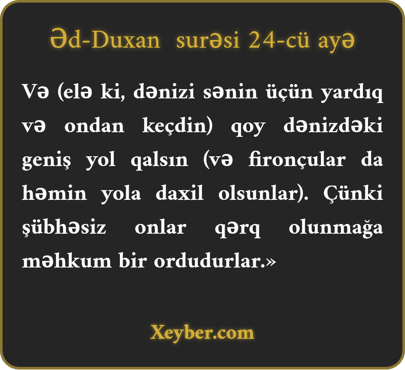 Və (elə ki, dənizi sənin üçün yardıq və ondan keçdin) qoy dənizdəki geniş yol qalsın (və fironçular da həmin yola daxil olsunlar). Çünki şübhəsiz onlar qərq olunmağa məhkum bir ordudurlar.»