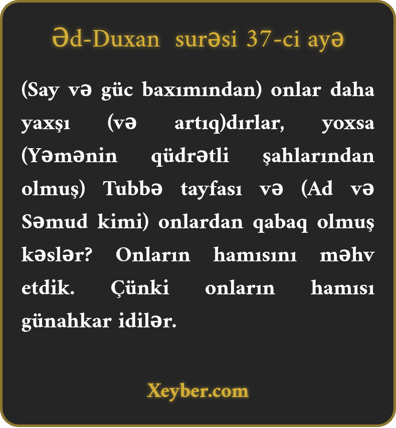 (Say və güc baxımından) onlar daha yaxşı (və artıq)dırlar, yoxsa (Yəmənin qüdrətli şahlarından olmuş) Tubbə tayfası və (Ad və Səmud kimi) onlardan qabaq olmuş kəslər? Onların hamısını məhv etdik. Çünki onların hamısı günahkar idilər.