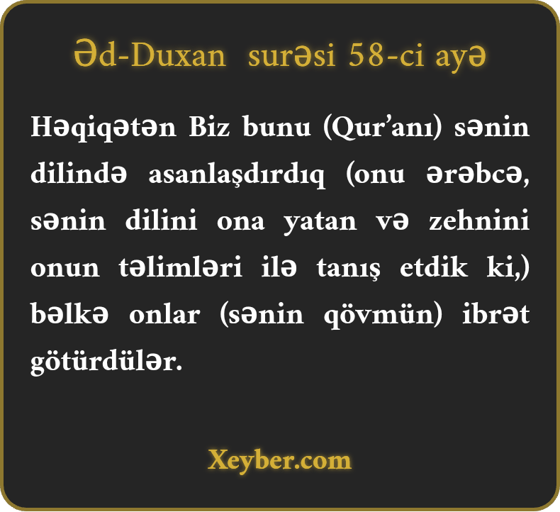 Həqiqətən Biz bunu (Qur’anı) sənin dilində asanlaşdırdıq (onu ərəbcə, sənin dilini ona yatan və zehnini onun təlimləri ilə tanış etdik ki,) bəlkə onlar (sənin qövmün) ibrət götürdülər.