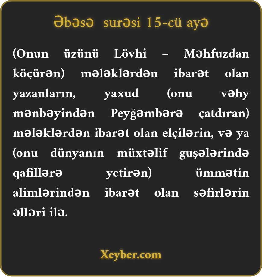 (Onun üzünü Lövhi – Məhfuzdan köçürən) mələklərdən ibarət olan yazanların, yaxud (onu vəhy mənbəyindən Peyğəmbərə çatdıran) mələklərdən ibarət olan elçilərin, və ya (onu dünyanın müxtəlif guşələrində qafillərə yetirən) ümmətin alimlərindən ibarət olan səfirlərin əlləri ilə.