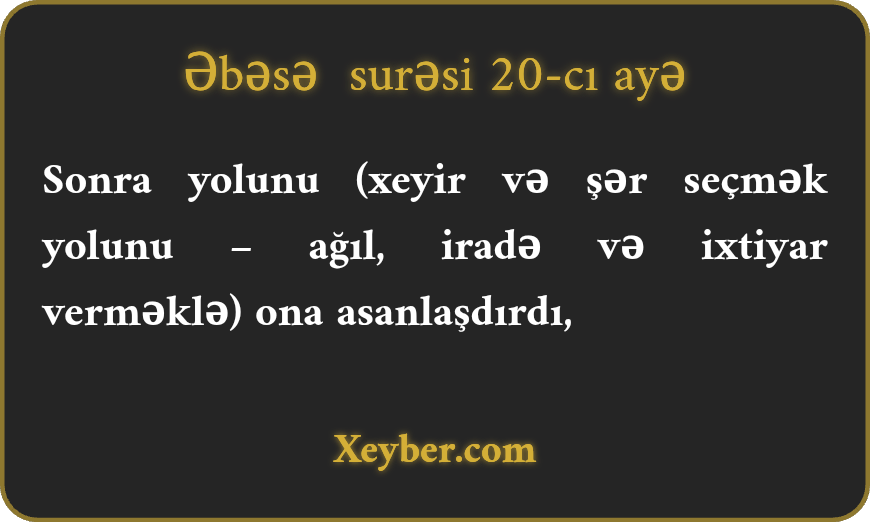 Sonra yolunu (xeyir və şər seçmək yolunu – ağıl, iradə və ixtiyar verməklə) ona asanlaşdırdı,