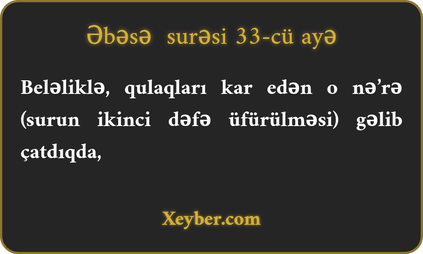 Beləliklə, qulaqları kar edən o nə’rə (surun ikinci dəfə üfürülməsi) gəlib çatdıqda,
