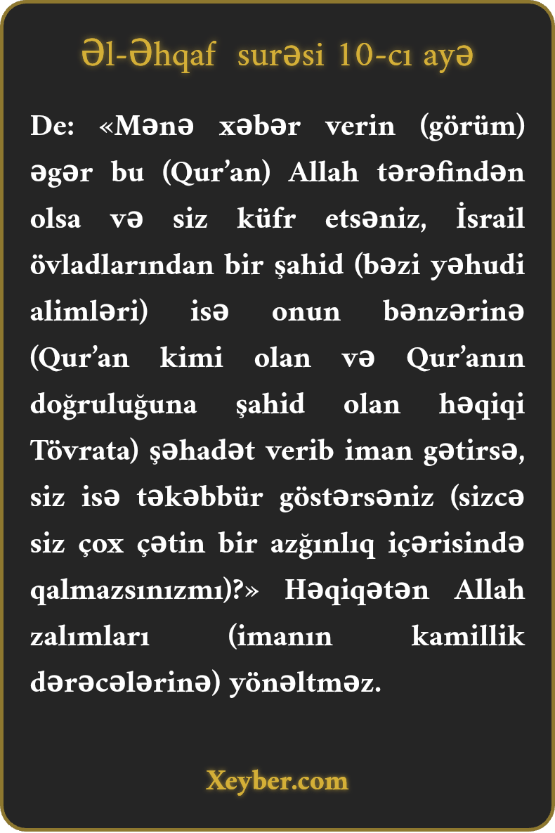 De: «Mənə xəbər verin (görüm) əgər bu (Qur’an) Allah tərəfindən olsa və siz küfr etsəniz, İsrail övladlarından bir şahid (bəzi yəhudi alimləri) isə onun bənzərinə (Qur’an kimi olan və Qur’anın doğruluğuna şahid olan həqiqi Tövrata) şəhadət verib iman gətirsə, siz isə təkəbbür göstərsəniz (sizcə siz çox çətin bir azğınlıq içərisində qalmazsınızmı)?» Həqiqətən Allah zalımları (imanın kamillik dərəcələrinə) yönəltməz.