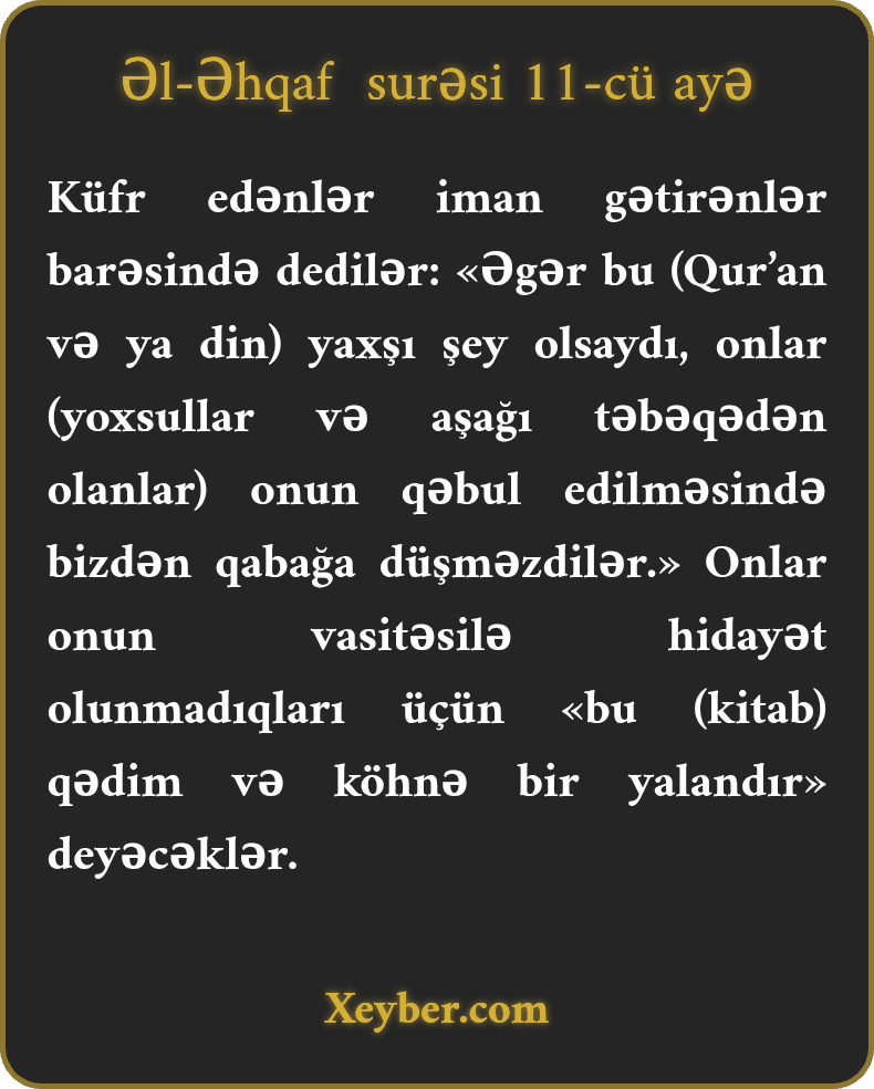 Küfr edənlər iman gətirənlər barəsində dedilər: «Əgər bu (Qur’an və ya din) yaxşı şey olsaydı, onlar (yoxsullar və aşağı təbəqədən olanlar) onun qəbul edilməsində bizdən qabağa düşməzdilər.» Onlar onun vasitəsilə hidayət olunmadıqları üçün «bu (kitab) qədim və köhnə bir yalandır» deyəcəklər.