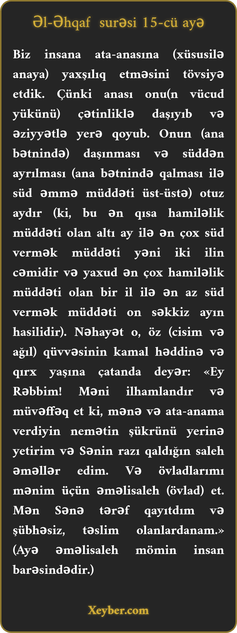 Biz insana ata-anasına (xüsusilə anaya) yaxşılıq etməsini tövsiyə etdik. Çünki anası onu(n vücud yükünü) çətinliklə daşıyıb və əziyyətlə yerə qoyub. Onun (ana bətnində) daşınması və süddən ayrılması (ana bətnində qalması ilə süd əmmə müddəti üst-üstə) otuz aydır (ki, bu ən qısa hamiləlik müddəti olan altı ay ilə ən çox süd vermək müddəti yəni iki ilin cəmidir və yaxud ən çox hamiləlik müddəti olan bir il ilə ən az süd vermək müddəti on səkkiz ayın hasilidir). Nəhayət o, öz (cisim və ağıl) qüvvəsinin kamal həddinə və qırx yaşına çatanda deyər: «Ey Rəbbim! Məni ilhamlandır və müvəffəq et ki, mənə və ata-anama verdiyin nemətin şükrünü yerinə yetirim və Sənin razı qaldığın saleh əməllər edim. Və övladlarımı mənim üçün əməlisaleh (övlad) et. Mən Sənə tərəf qayıtdım və şübhəsiz, təslim olanlardanam.» (Ayə əməlisaleh mömin insan barəsindədir.)