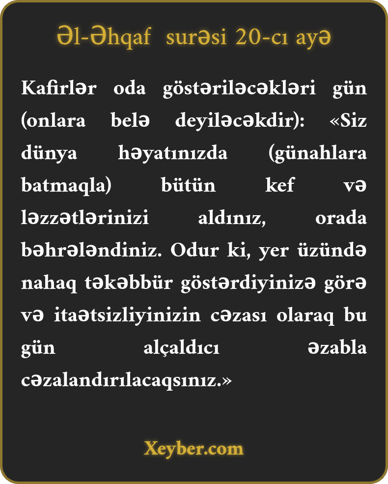 Kafirlər oda göstəriləcəkləri gün (onlara belə deyiləcəkdir): «Siz dünya həyatınızda (günahlara batmaqla) bütün kef və ləzzətlərinizi aldınız, orada bəhrələndiniz. Odur ki, yer üzündə nahaq təkəbbür göstərdiyinizə görə və itaətsizliyinizin cəzası olaraq bu gün alçaldıcı əzabla cəzalandırılacaqsınız.»