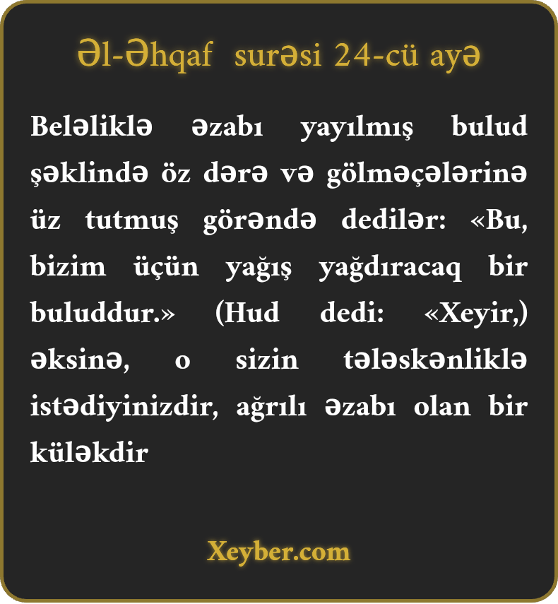 Beləliklə əzabı yayılmış bulud şəklində öz dərə və gölməçələrinə üz tutmuş görəndə dedilər: «Bu, bizim üçün yağış yağdıracaq bir buluddur.» (Hud dedi: «Xeyir,) əksinə, o sizin tələskənliklə istədiyinizdir, ağrılı əzabı olan bir küləkdir