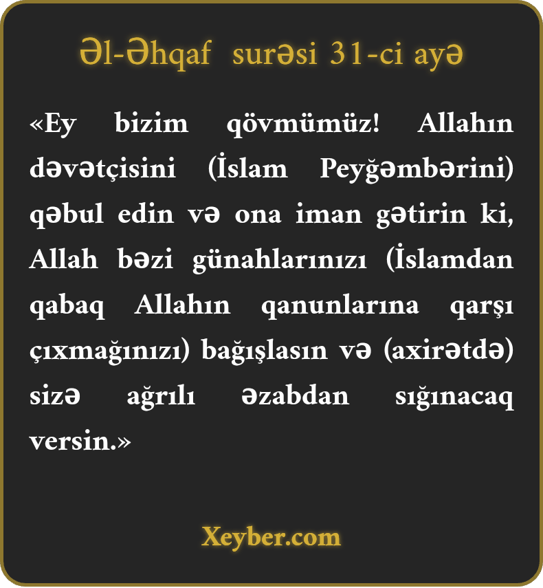 «Ey bizim qövmümüz! Allahın dəvətçisini (İslam Peyğəmbərini) qəbul edin və ona iman gətirin ki, Allah bəzi günahlarınızı (İslamdan qabaq Allahın qanunlarına qarşı çıxmağınızı) bağışlasın və (axirətdə) sizə ağrılı əzabdan sığınacaq versin.»