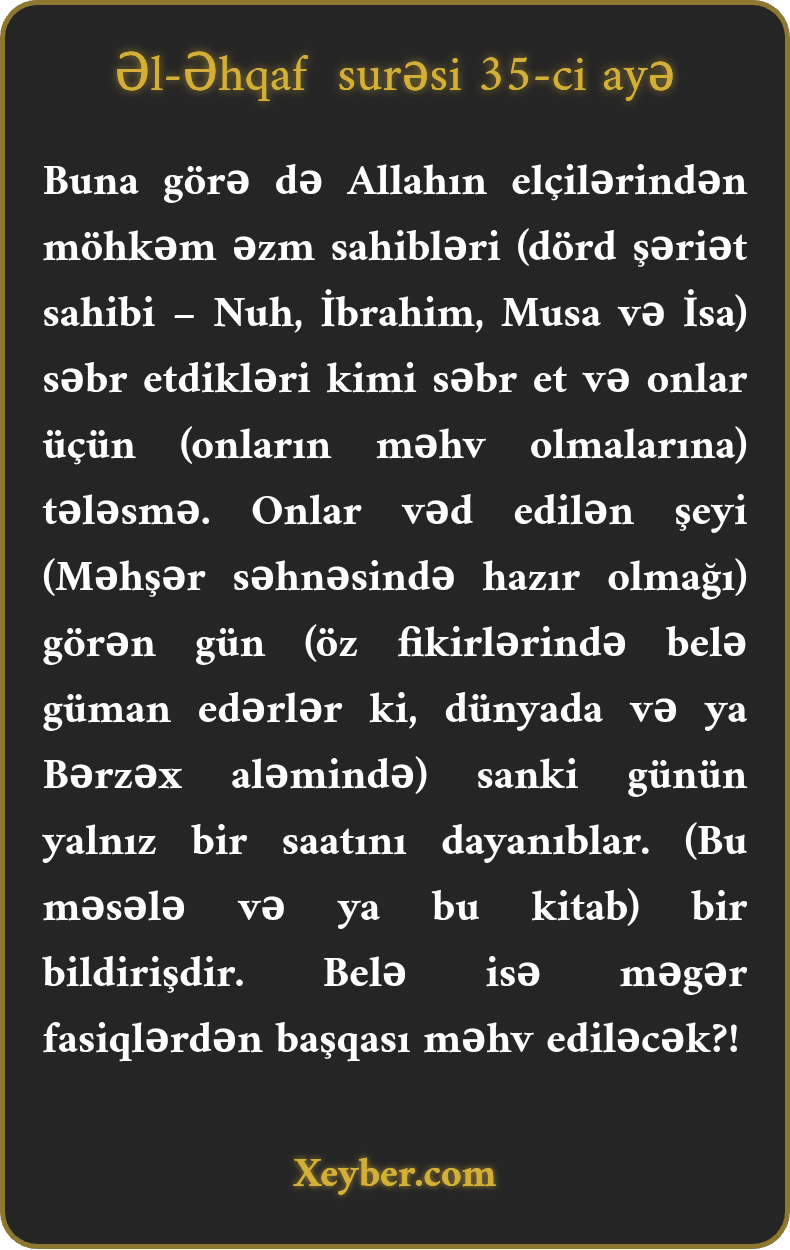 Buna görə də Allahın elçilərindən möhkəm əzm sahibləri (dörd şəriət sahibi – Nuh, İbrahim, Musa və İsa) səbr etdikləri kimi səbr et və onlar üçün (onların məhv olmalarına) tələsmə. Onlar vəd edilən şeyi (Məhşər səhnəsində hazır olmağı) görən gün (öz fikirlərində belə güman edərlər ki, dünyada və ya Bərzəx aləmində) sanki günün yalnız bir saatını dayanıblar. (Bu məsələ və ya bu kitab) bir bildirişdir. Belə isə məgər fasiqlərdən başqası məhv ediləcək?!