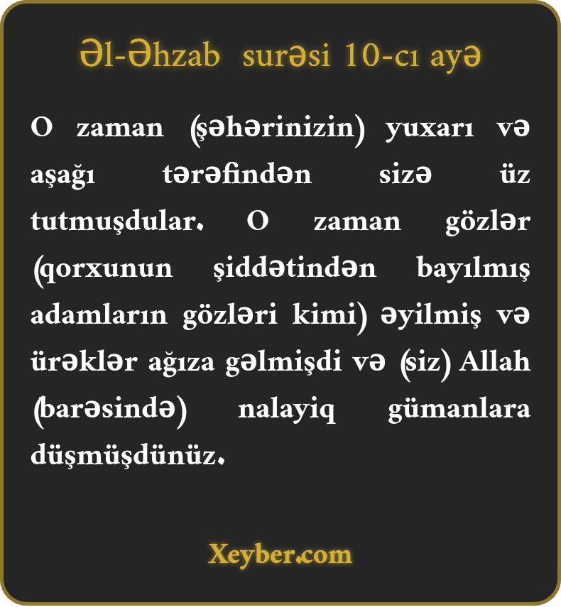 O zaman (şəhərinizin) yuxarı və aşağı tərəfindən sizə üz tutmuşdular. O zaman gözlər (qorxunun şiddətindən bayılmış adamların gözləri kimi) əyilmiş və ürəklər ağıza gəlmişdi və (siz) Allah (barəsində) nalayiq gümanlara düşmüşdünüz.