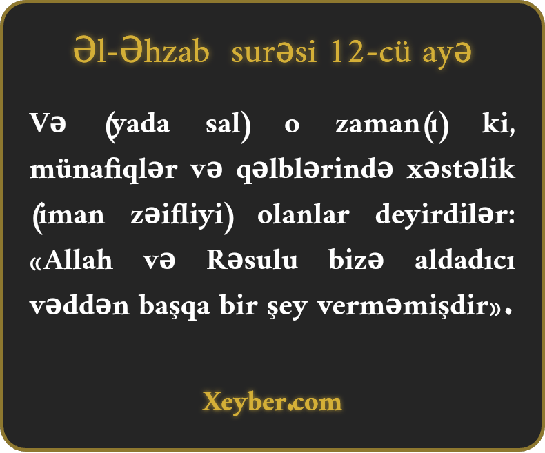 Və (yada sal) o zaman(ı) ki, münafiqlər və qəlblərində xəstəlik (iman zəifliyi) olanlar deyirdilər: «Allah və Rəsulu bizə aldadıcı vəddən başqa bir şey verməmişdir».