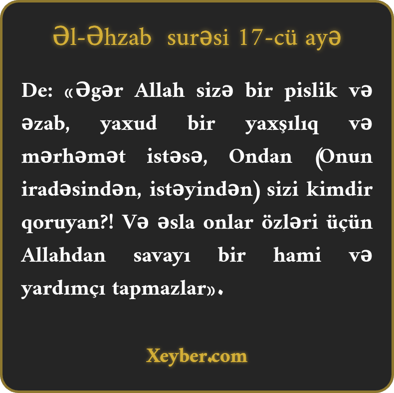 De: «Əgər Allah sizə bir pislik və əzab, yaxud bir yaxşılıq və mərhəmət istəsə, Ondan (Onun iradəsindən, istəyindən) sizi kimdir qoruyan?! Və əsla onlar özləri üçün Allahdan savayı bir hami və yardımçı tapmazlar».