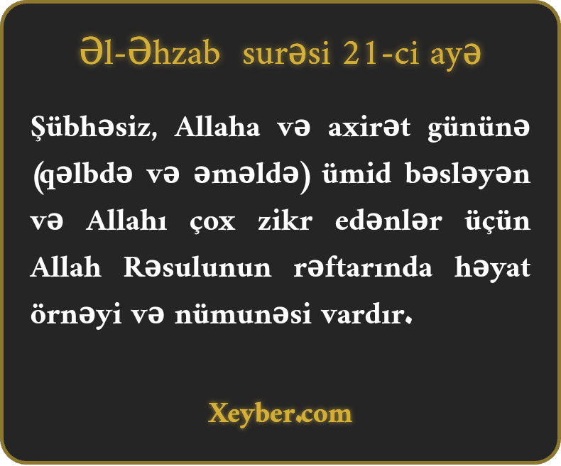 Şübhəsiz, Allaha və axirət gününə (qəlbdə və əməldə) ümid bəsləyən və Allahı çox zikr edənlər üçün Allah Rəsulunun rəftarında həyat örnəyi və nümunəsi vardır.