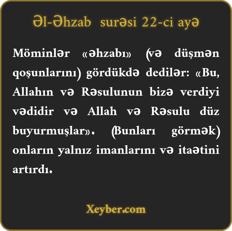 Möminlər «əhzabı» (və düşmən qoşunlarını) gördükdə dedilər: «Bu, Allahın və Rəsulunun bizə verdiyi vədidir və Allah və Rəsulu düz buyurmuşlar». (Bunları görmək) onların yalnız imanlarını və itaətini artırdı.