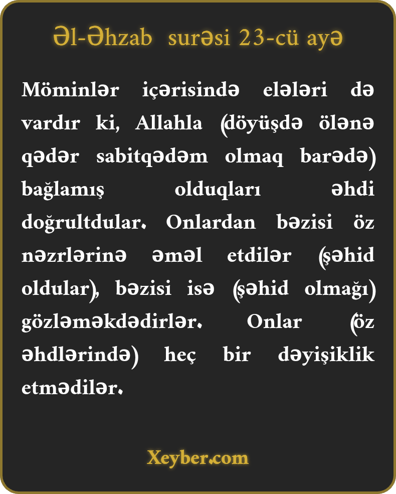 Möminlər içərisində elələri də vardır ki, Allahla (döyüşdə ölənə qədər sabitqədəm olmaq barədə) bağlamış olduqları əhdi doğrultdular. Onlardan bəzisi öz nəzrlərinə əməl etdilər (şəhid oldular), bəzisi isə (şəhid olmağı) gözləməkdədirlər. Onlar (öz əhdlərində) heç bir dəyişiklik etmədilər.